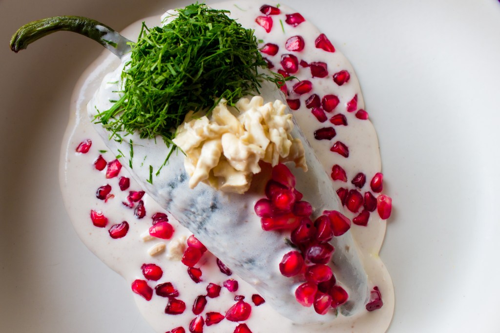 ¿Crees que has probado una buena nogada? El chef Ulises Palafox tiene un reto y una sorpresa para ti: una nogada sedosa y ligera llena de sabor que cubre este chile pleno de detalles. ¡Maíz tinto te espera en su nueva ubicación, visítalo!